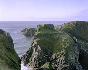 On the Northern coast of Ireland lies a small fishing island used in the past to capture fish in the gap between lands. A narrow rope bridge swings in the wind above the rushing water below. Captured using a vintage 4x5 field camera. Ireland - July 2019