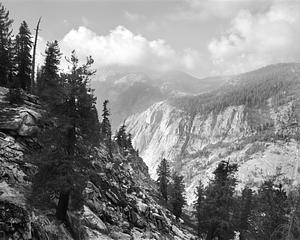 Pine trees hold onto the rocky hillside as the sun begins to set. This vantage point serves as a great place to rest and take in the fantastic view that lies below. Captured using a vintage 4x5 field camera. Sequoia National Park - July 2020