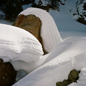 A thick layer of fresh snow layered onto of a grouping of rocks high in the Rockies. Captured on a Rolleiflex which offers a square format on film. Rocky Mountain National Park - March 2021